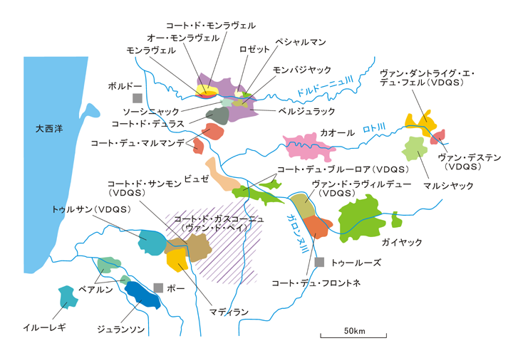 VDQSワインの産地はロト川上流のヴァン・ダントライグ・エ・デュ・フェル,ヴァン・デステン,ガロンヌ川流域のコート・デュ・ブルーロア,ヴァン・デュ・ラヴィルデュー,ポー市北方コート・ド・サンモン,トゥルサンがあります.ガロンヌ川西側一帯ではアルマニャックブランデーが造られていますが,ここではヴァン・ド・ペイのコート・ド・ガスコーニュの生産が増えてきています.